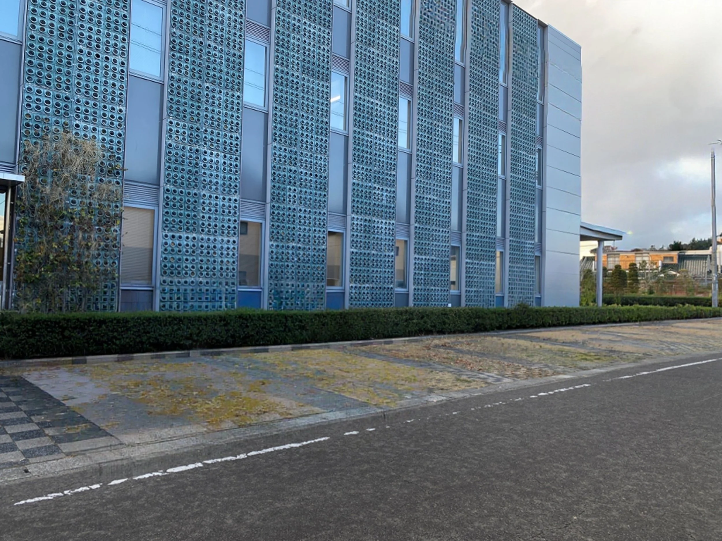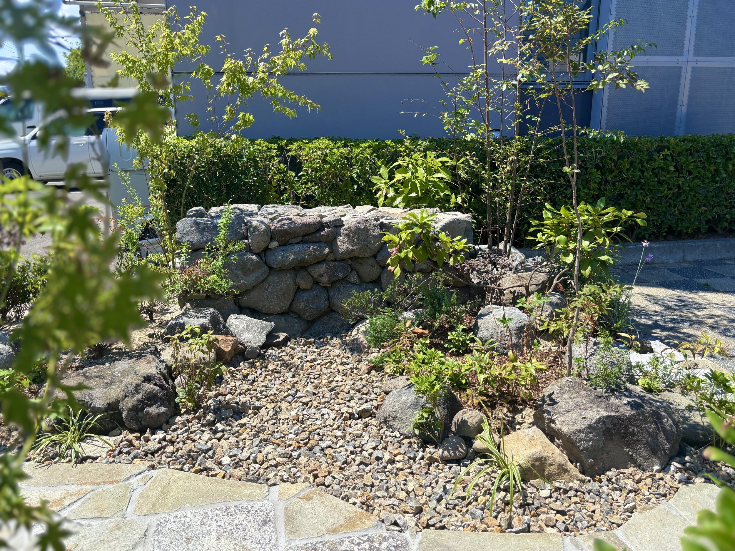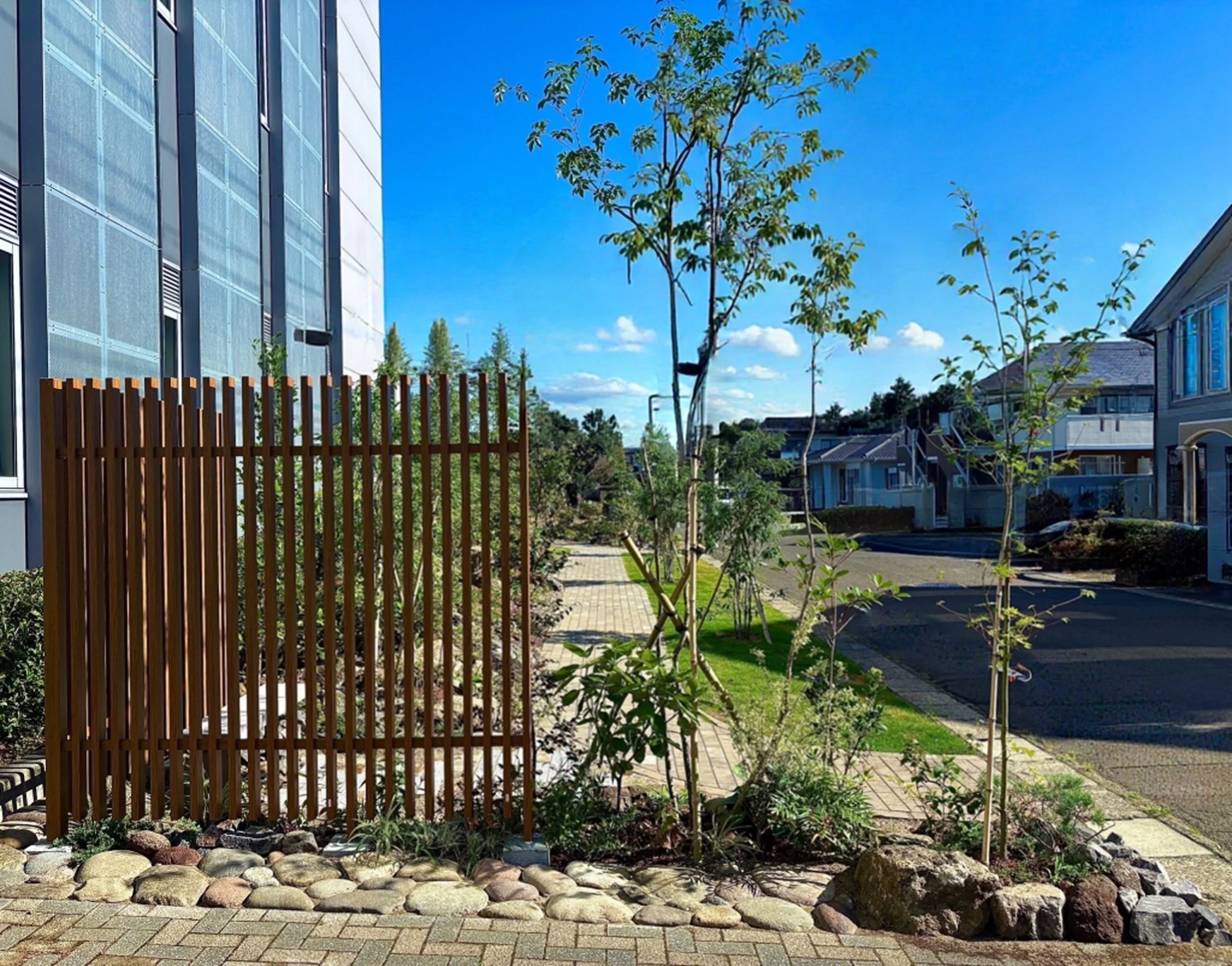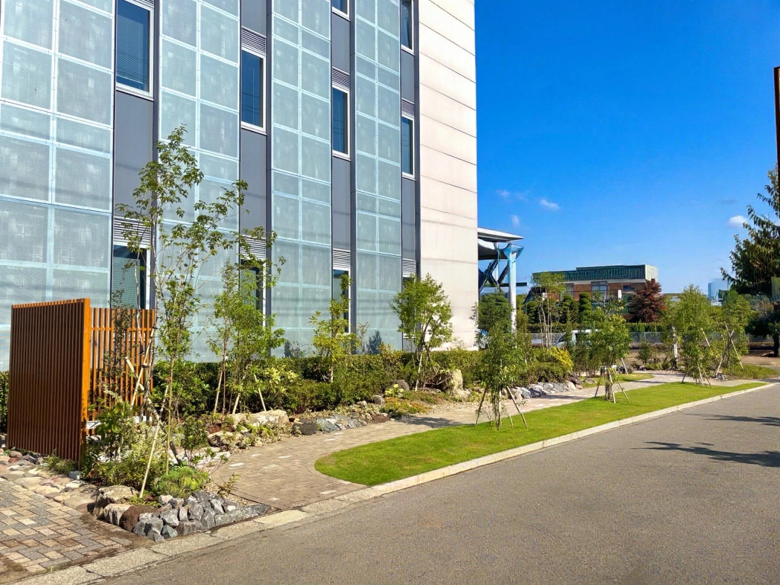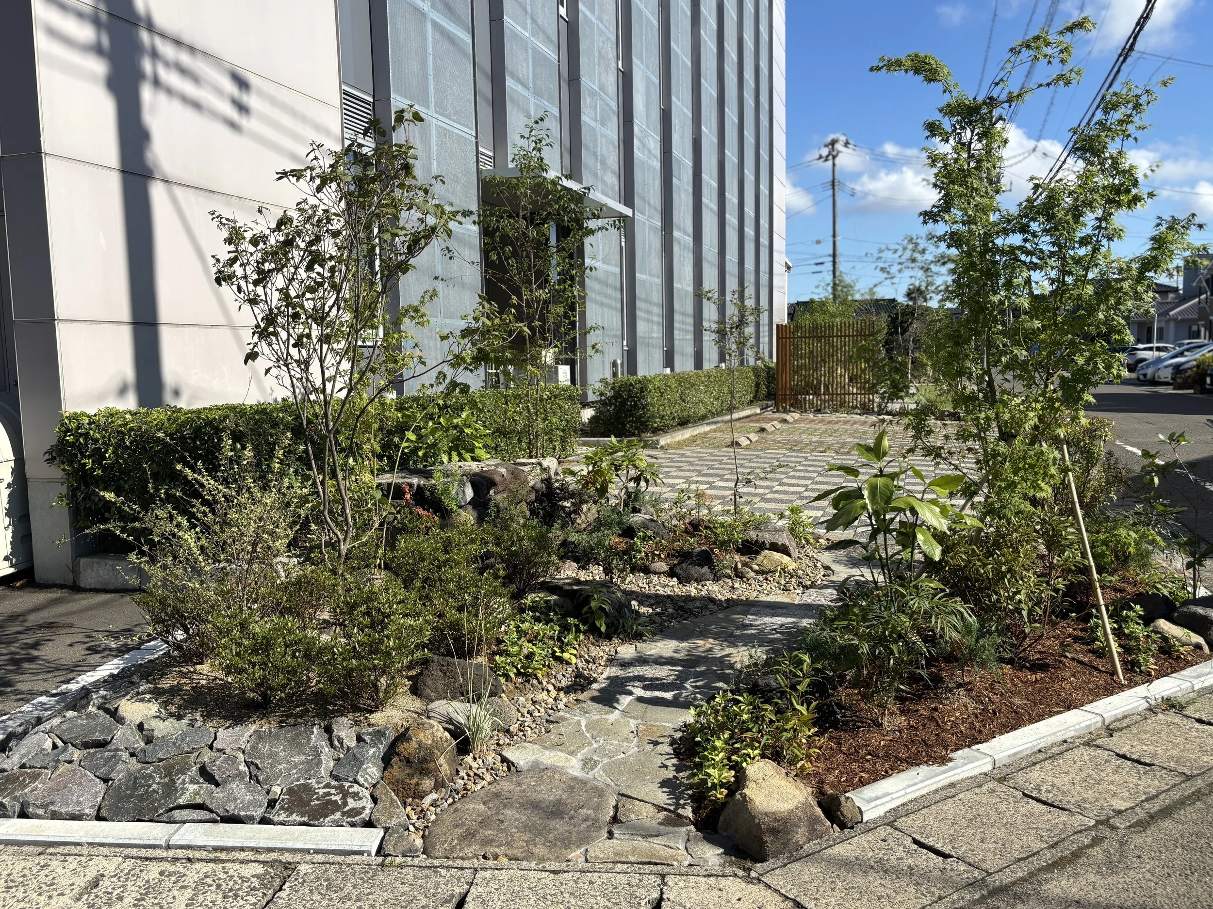 既存の駐車場を撤去し、本社屋周辺の緑地整備を行いました。レンガによるアプローチの新設やベンチの設置、建物や周辺環境に合わせた植栽計画を行っています。駐車スペースには芝生が育つ専用の舗装材を敷き、緑の駐車場に仕上げました。緑地化に加え、利用される方が安らげる空間となるよう、全体の設計を行っています。